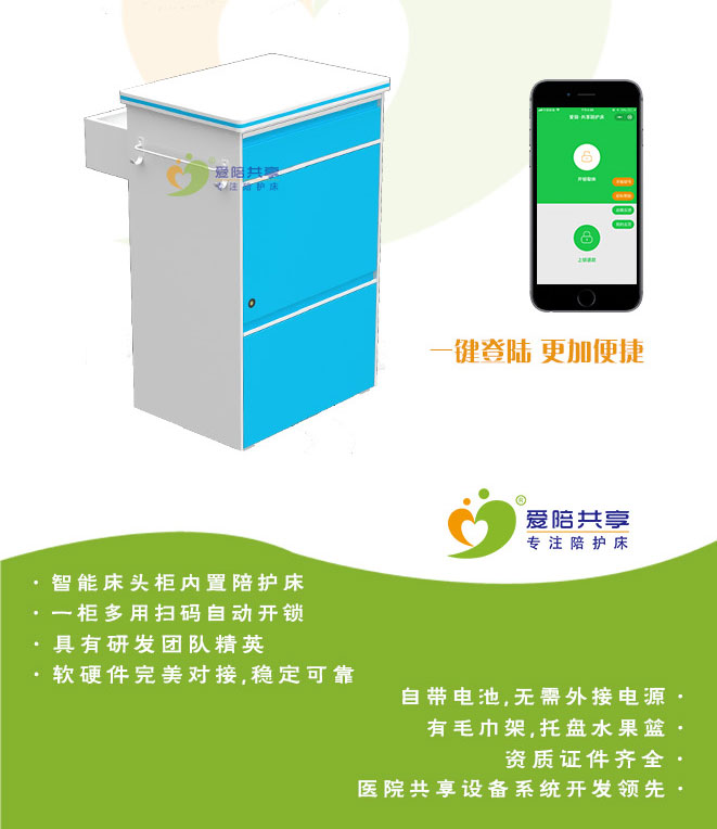 共享陪護床適用很多大醫院,可以選擇直接購置新型的設備為患者和家屬提供便利,也可以合作供應商免費進行投放,在使用的過程中可為醫院以后的發展打下良好的基礎。共享陪護床是一款多功能的產品,即可當床頭柜使用,又可做陪護床,相對成本價要高一些,但這種共享智能陪護床是未來的發展趨勢。愛陪共享陪護床咨詢:400-993-6038